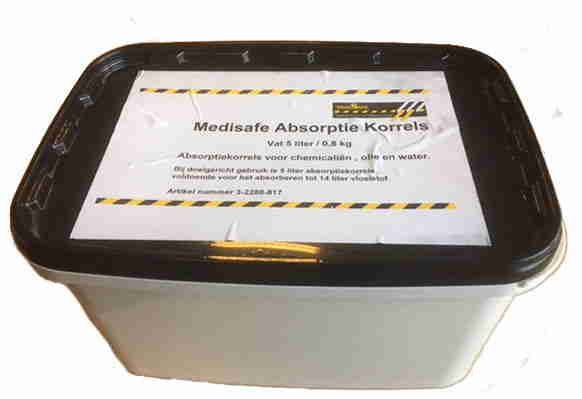 Milieuvriendelijke absorptiekorrels in hersluitbare plastic bak met handgreep.