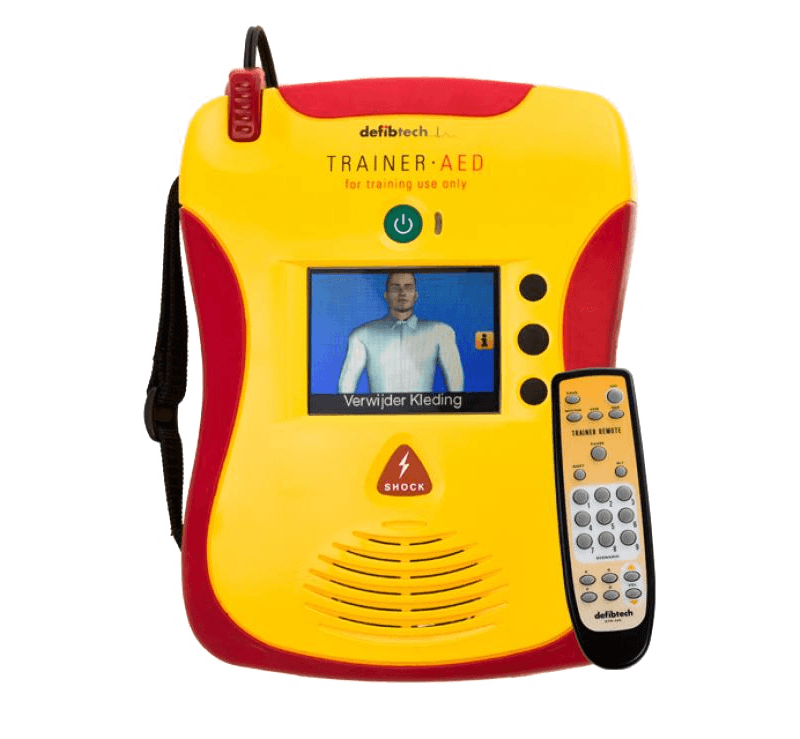 De trainer lijkt qua uiterlijk en instructies sterk op de echte AED, inclusief scherm en stembegeleiding. Hij geeft echter géén schok af en is uitsluitend bedoeld voor oefensessies. Hierdoor kunnen cursisten veilig vertrouwd raken met de bediening.