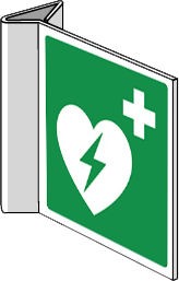 Haaks bord met het logo om aan te geven waar de locatie van de AED is. De afmeting van het bord is 200x200mm, het is dubbelzijdig bedrukt.