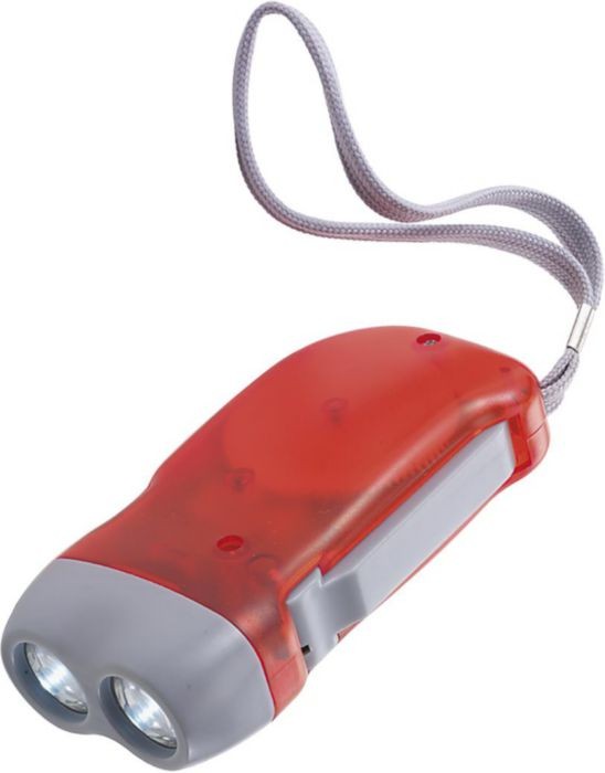 Deze zaklamp bevat geen batterijen maar wordt opgeladen door in het handvat te knijpen.