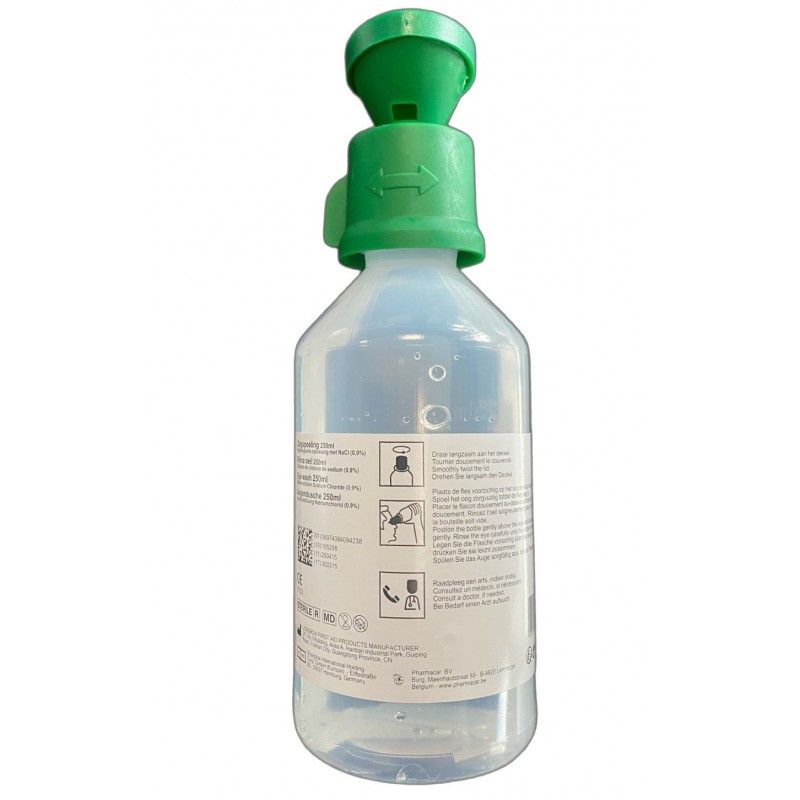 Inhoud: 250 ml fysiologische zoutoplossing (0,9% natriumchloride) Gebruik: Direct klaar voor gebruik, geen voorbereiding nodig Spoeltijd: Circa 2,5 minuten Ergonomisch ontwerp: Comfortabele oogschelp voor effectieve spoeling Eenmalig gebruik: Hygiënisch en veilig Past in de meeste oogspoelstations Gebruiksaanwijzing in verschillende talen Verpakt met beschermende folie Handige draaidop Dop op de fles om het oogbadje te beschermen tegen stof en vuil