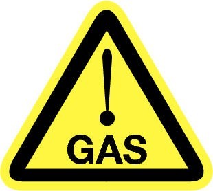 Pictogram met waarschuwing voor de aanwezigheid van gas. In diverse uitvoeringen.